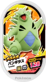 Tyranitar (Japanese: バンギラス Bangiras) is a Grade 4 Pokémon Mezastar tag. It is part of the first Double Chain set.