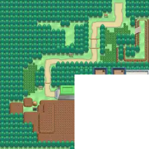 A graphical glitch happens in this route: there are two buildings in the north of Accumula Town that should be seen from a section of the road, but they don't get rendered due to a process of clipping activated when exiting the gate to route 2. By cheating, it is possible to exit Accumula Town through the trees and view the buildings in full.