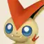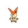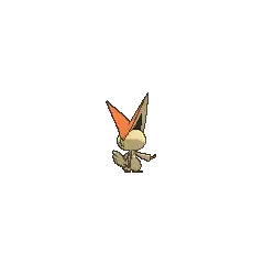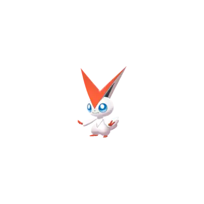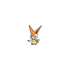 Victini is a small, rabbit-like Pokémon with large, pointed ears which form the letter V. It has large, blue eyes and a round, cream-colored head, which is comparatively large compared to its small, cream body, while the tops of its ears, crest, and extremities are all orange. Its bulbous arms and legs are rounded to make a sort of "cuff" before ending with small, three-fingered hands and two-toed feet. It has two pointed teeth that can be seen on its upper jaw. It also has two cream winglike tails, which allow it to fly. Though timid, it is a caring Pokémon; it will fight if its friends are in danger.