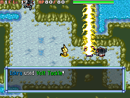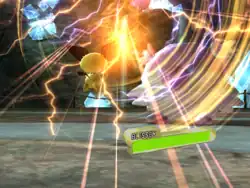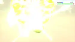 Pikachu runs at the opponent. Then, its body becomes surrounded by golden electricity, and it tackles the opponent. Alternatively, lightning strikes Pikachu, and it tackles the opponent while electrified. While covered in electricity, Pikachu's body looks black and white. When hit by recoil damage, its body becomes surrounded by yellow sparks of electricity. On occasion, this will paralyze the opponent. | ||