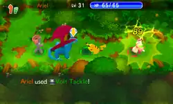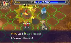 Volt Tackle deals damage and the user receives recoil damage. In the Rescue Team and Explorers series, the recoil damage is equal to ⅛ of the user's maximum HP. From Gates to Infinity onward, Volt Tackle may now cause paralysis and the recoil damage is instead 20% of the user's max HP.