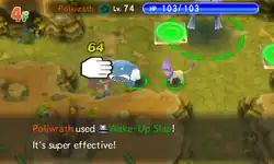 Wake-Up Slap deals damage. If the target is sleeping, this move has double the power and causes the target to wake up.