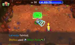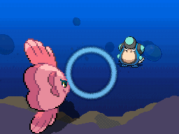 Shellos opens its mouth and a blue ball of energy appears in front of it. It then fires a spiraling stream of water from the ball at the opponent. | ||