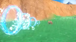Dewott holds out both of its arms in the shape of a 'T' and opens its mouth. A light blue orb of energy appears in front of Dewott's mouth and it fires it at the opponent. When the orb hits the opponent, it expands and surrounds the opponent in a large orb of water. The orb then floats into the air and the water starts to swirl around from all sides, causing the orb to explode; or, Dewott releases a stream of water surrounded by rings from its mouth at the opponent. | ||