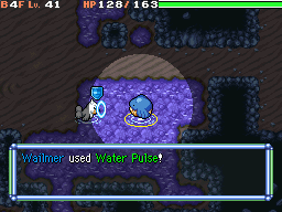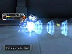 Buizel puts its hands together and forms a blue ball. It then throws the ball at the floor and it glides on the ground across a stream of water at the opponent, hitting it; or, Buizel throws the ball at the ground and it turns into a huge wave of water, with the wave going and hitting the opponent. On occasion, this will confuse the opponent. | ||