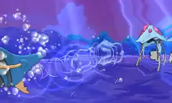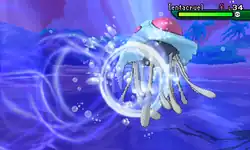 Frillish puts its tentacles in front of its body and forms a light blue ball of energy in between them. It then pushes the ball with its tentacles, slightly making it smaller. It then throws the orb at the opponent. When the ball hits the opponent, it expands and surrounds the opponent in a large orb of water. The water then swirls around from all sides, causing the water to explode. On occasion, this will confuse the opponent. | ||