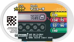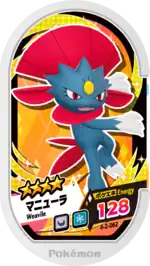 Weavile (Japanese: マニューラ Manyula) is a Grade 4 Pokémon Mezastar tag. It is part of the second Gorgeous Star set.