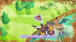 The ending begins with Pikachu, Lycanroc, Torracat and Rowlet floating in on clouds. Pikachu wakes the sleeping Torracat and Rowlet, and all four jump back towards the backdrop of Melemele Island. The next scene shows a glass drink with a reflection of Ash's friends, Officer Jenny and Nurse Joy at a beach. The scene then changes to Ash's and his friends' Pokémon riding on top of Solgaleo.