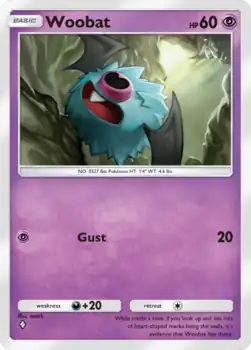 Woobat (Japanese: コロモリ Koromori) is a Psychic-type Basic Pokémon card in Pokémon Trading Card Game Pocket. It is part of the Eevee Grove expansion.