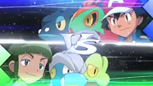 While Serena, Bonnie, Dedenne, and Braixen are busy admiring the many different fashion designs, Ash asks Sawyer for a battle. Sawyer requests a Double Battle, and Ash agrees, and Clemont follows them to act as the referee. Ash sends out Hawlucha and Frogadier, while Sawyer chooses his Treecko and Bagon. Sawyer uses Bagon's hard head to great effect, but Hawlucha counters with repeated Karate Chops to wear down Bagon's endurance. Although a combination of Leech Seed and Fire Fang nearly makes contact with Hawlucha, Frogadier intervenes at the last minute with Water Pulse, allowing Hawlucha to escape. Sawyer then compliments Ash on the teamwork with his Pokémon. Frogadier then successfully dodges two Bullet Seed attacks and counters the third with Cut, taking Treecko out of the match. Meanwhile, Serena and Bonnie are approached by two girls, who ask for their help with something, and as Ash and Sawyer are about to continue their battle, it is interrupted by their noticing the start of a fashion show.