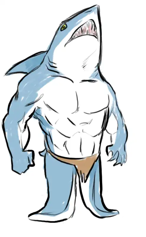 Aarongar are fish humanoids born of experimentation. They have a pointed shark head and a large dorsal fin. They have only a thick trunk of a neck which connects to their human-like torso. They have thick humanoid arms ending with webbed hands Their legs are thick and stumpy and their feet are the thick end of a flipper. They have only a small bit of a tailbone rather than a tail. Aarongar bodies are completely covered in smooth sharkskin, with colors ranging from albino, blue, grey and black, and always have white undersides. Their eyes are that of a shark but can be a variety of colors, like a human iris. They also have tongues, unlike a shark.
