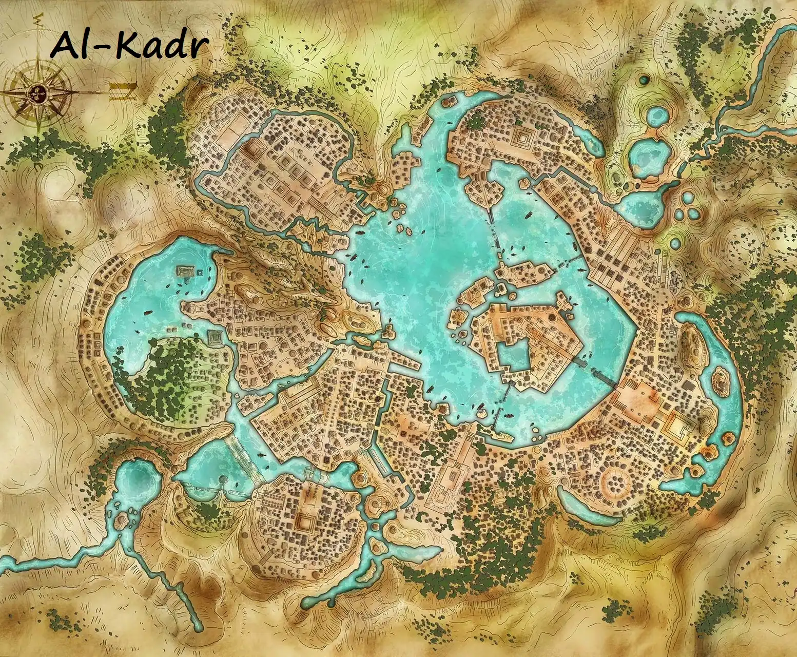 Al-Kadr, City of the Enlightened Search and the first city on the long Pilgrim's Road north to Kwazarmia, land of the Pantheist League. Al-Kadr is both a testament to the reach and power of the League and an emblem of what it used to be. The sprawling city sits inside the Oasis of the Moon, a massive depression in the desert and rock in which the Sayaj River pools and forms the beautiful lakes of Al-Kadr. Viewing the city from the top of the rocky hills overlooking its sprawl, a traveler could not help to miss the five massive temples that jump from the city like mountains through forest. But at the same time, the ruin and wear of time and calamity are evident. The unfinished sixth Temple, the Temple of the Unknown that sparked the Pantheist Schism and civil war, is but the largest derelict structure in the city. Fallen bridges and broken buildings are scattered throughout the city. So the city lies like two sides of a coin. On the one face, it is a bustling large city and the face of the Pantheon to the world, but on the other it is littered with the scars of time and war