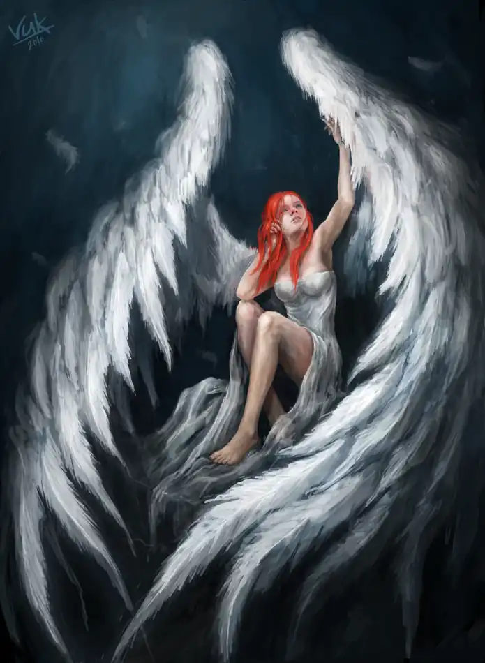 Generally, Angels tend to be fair-skinned, winged humanoids. They are often far taller than humans, with even the shortest being able to stare the tallest man in the eye though this height belies their incredible lightness, seeming to weigh almost nothing. Their perfectionist and elitist attitude is often reflected in their appearance, seeming to condescend those around them with their looks alone. Most races would consider them beautiful at worst and God-like at best, though this of course depends on the beholder. They have bright, plumed and often perfectly groomed white feathered wings. Chromatic differences in hair, skin and eyes are more diverse than any other race with many having such colours as blonde, pink and gold to name a few. Near-White skin, blonde hair and golden eyes are however, typical of most. First Angels are unique among their kind as there wings are of variable length, should they wish a First Angel can extend their wings to a minimum of 1.5 times the span of their arms in order to fly or can extend them to up to 4 times the span of their arms. This increases their size in all directions causing them to rest just above the ground. Though all wings are white in colour this can vary from a perfect alabaster, all the way to a dusty grey.