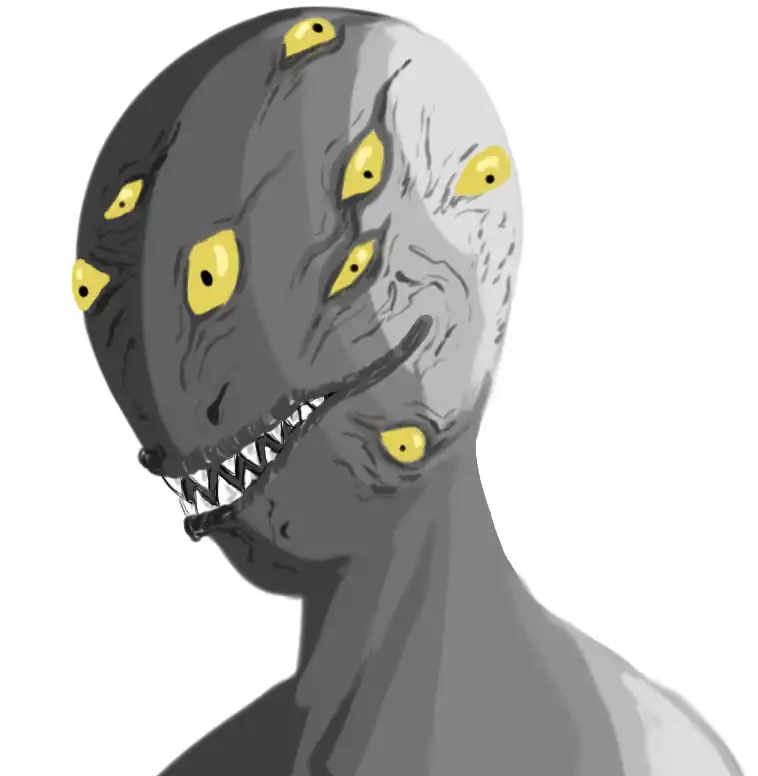 Half-Mimics resemble humans, although their face is deformed and foul. Most of the face is taken up with a huge fanged mouth, with misplaced eyes seeming randomly placed on the face. Their eyes are predatory and cat like, glowing yellow with the magical power which has made them. Unlike full-blooded mimics there is nothing about them that human beings find sexually attractive.