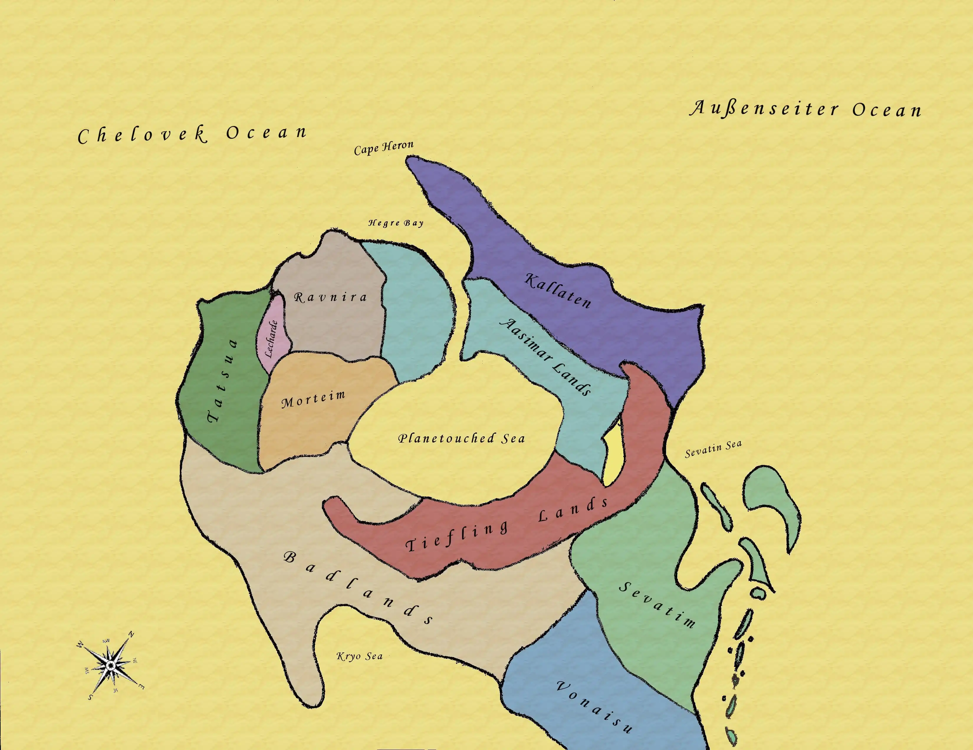 Paramýth is based around one continent, called Paramýth by those who keep stories. The name comes from how it was perceived by its first human inhabitants (called the Vackel by the current inhabitants), as a land from a storybook. Its name comes from the Vake word for story.