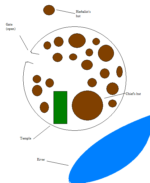 The village of Pediro has a shaman and a magically-unskilled herbalist who lives in a hut just outside of the walls. The economy is simple, being based on fishing from the nearby river, and hunting in the nearby woods. There is a small, open space in the center of the village which serves as meeting place, arena, and market, depending on what day it is. Market days are held every three days, and arena fighting occurs monthly. Meetings are called on contingency. There is also a small wooden temple, which is the second-largest building in the village; the residence of the chief in the largest structure in the settlement.