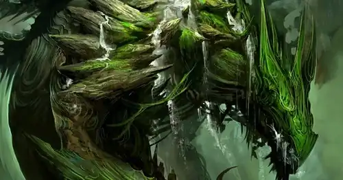 Mordremoth, the Elder Dragon of Plantlife and the Mind, is one of the most poorly understood Elder Dragons. It has never made any kind of physical appearance, interacting with the world only through the creeping tendrils that are its limbs, and the horrific images it can send into the minds of others to warp them to its will. Its servants, the Mordrem, are horrific creatures which represent twisted parodies of plantlife. It also created the Mordrem Guard, humanoid plant warriors of which the Sylvari are an offshoot. It dwells within the sweltering Maguuma Jungle, a vast area of greenery where it is virtually unassailable. Even an entire fleet of airships was brought down by the might of Mordremoth, such that the edge of the jungle is further endangered by the sites of countless airship wrecks.
