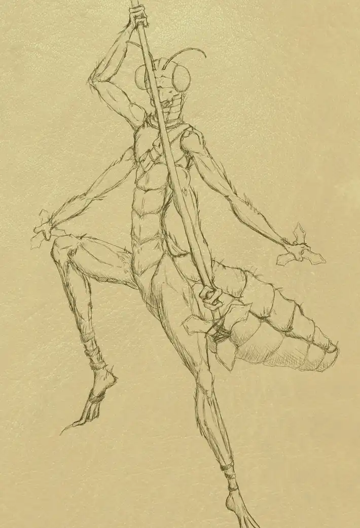 Thri-kreen are mantis-like humanoids, who, by some accounts, resemble ants. Their most significant feature, aside from appearance, is their four arms, one large, normal pair and one smaller pair of arms beneath the first. They have bulging eyes, large powerful legs, clicking mandibles, and an armored exoskeleton. Their coloration ranges from sandy browns, yellows, and reds to coppery green and glossy blacks, depending on climate and diet. They possess thin tongues and have a buzzing hum to their voices.