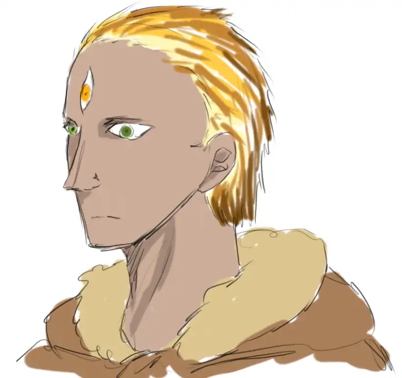These three eyed creatures are rumored to be able to see the future at young ages and lose this ability when they mature. Many only see them on their travels into the mountains and on trading routes. Taller than most humans, they range from 5'11 to 6'8. Their skin is usually sun-kissed tan, and their hair, a dirty blonde to a deep brown. Their eyes shine bright like peridots, and their third eye embedded in their forehead is a deep amber colour. They tend to keep their hair short to their scalps, and oftentimes are very muscular.