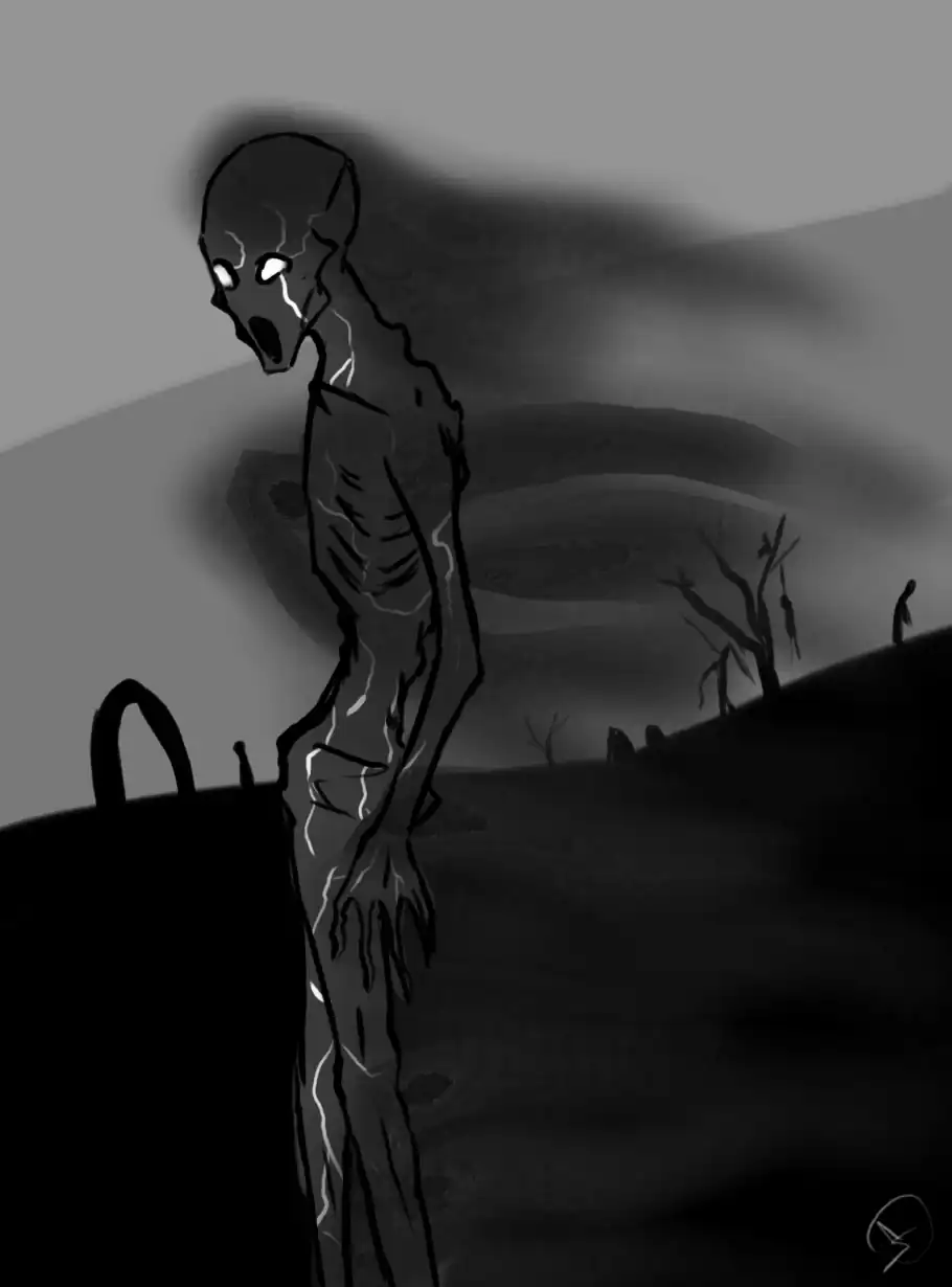 Veilwalkers take on the form of a ash-skinned humanoid. They are covered in glowing cracks, emanating from the fractured frankenstein souls they have. Their eyes are commonly blank and glazed. Not a hair grows on their skinny, emaciated, sexless bodys. Trails of dark wisps, resembling shreds of some veil-like material, enshroud their bodies and trail behind them as they walk. These wisps will billow even when there is no wind. Some veilwalkers have such a large amount of this material flowing from them that they appear to be a misty mass. They appear lightweight and really are.
