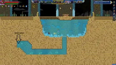 In the temple garden, right of the bedrooms, you will find a small water pond. Dive down there and follow the tunnel, you will find the Water switch at the end.