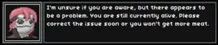 On Atropus planets, Kevin may appear and speak to the player, telling them, "Woooooooo, I'm totally not Kevin and just the voices of insanity telling you to shoot yourself in the abdomen. Do it." Additionally, he may also simply say "Greetings." to the player with no further dialogue. There are also other various lines he may tell to the player in an attempt to get them to kill themselves. It is unknown if he truly wants the player dead, or if it's just another one of his sick "pranks".