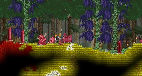 Hell Hives are overall quite easy to traverse - unless you count the bees, the cobwebs, and the admittedly unappealing scenery. First off, they consist mostly of Honey Material, Red Honeycombs... and Spider Silk, which will induce a debuff that decreases your movement rapidly but leaves shortly after stepping off of a Spider Silk block. On top of this lie 'disgusting blobs of seeping flesh', Heck Lights (both of which procure Raw Steak, Raw Tentacles, and Flesh Strands), Heck Pillars, Heck Altars, and many, many more weird and disgusting things.