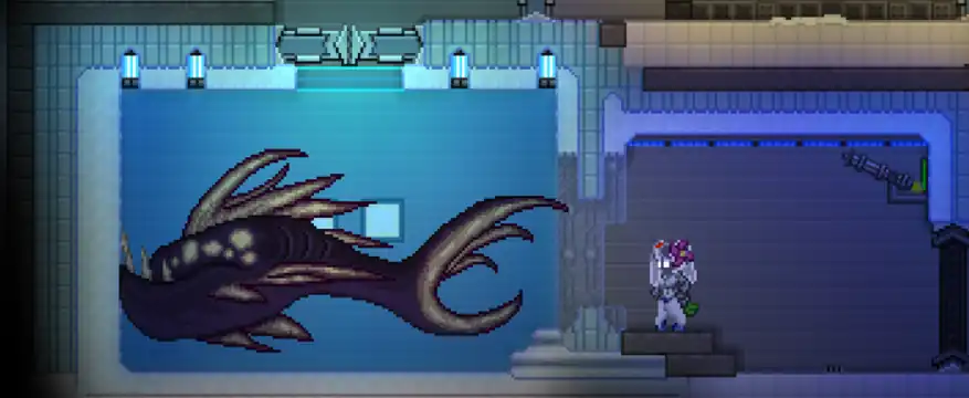 The Veilendrex is a massive piscine Creature with spine-like bone protrusions and a fanged lower jaw. It can both swim in Water and fly in the air, but cannot pass through blocks. It appears on Aether Sea planets and the Grand Pagoda Library.