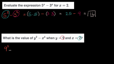 Learn how to substitute (or "plug in") values for variables and evaluate algebraic expressions.