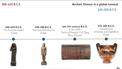 This tutorial traces the representation of the human body in monumental Greek sculpture from the earliest Egyptian influence to the increasing naturalism that lays the foundation for the Classical style.