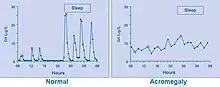 Frequent serum GH measurements in normal subjects (left panel) demonstrate that GH can fluctuate between undetectable levels most of the time intersperse with peaks of up to 30 μg/l (90 mIU/l); in acromegaly (right panel) GH hypersecretion is continuous with no undetectable levels.