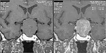 Acromegaly is usually caused by the pituitary gland producing excess growth hormone.[3] In more than 95% of cases the excess production is due to a benign tumor, known as a pituitary adenoma.[3] The condition is not inherited from a person's parents.[3] Rarely acromegaly is due to a tumor in another part of the body.[3] Diagnosis is by measuring growth hormone after a person has drunk a glucose solution, or by measuring insulin-like growth factor I in the blood.[3] After diagnosis, medical imaging of the pituitary is carried out to determine if an adenoma is present.[3] If excess growth hormone is produced during childhood, the result is the condition gigantism rather than acromegaly.[3]