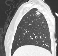 In radiology, the air crescent sign (also called the Monad sign[1]) is a finding on chest radiograph and computed tomography that is crescenteric and radiolucent, due to a lung cavity that is filled with air and has a round radiopaque mass.[2] Classically, it is due to an aspergilloma, a form of aspergillosis, that occurs when the fungus Aspergillus grows in a cavity in the lung.[3]