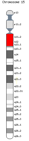 Angelman syndrome is caused by the loss of the normal maternal contribution to a region of chromosome 15, most commonly by deletion of a segment of that chromosome. Other causes include uniparental disomy, translocation, or single gene mutation in that region. A healthy person receives two copies of chromosome 15, one from the mother, the other from the father. However, in the region of the chromosome that is critical for Angelman syndrome, the maternal and paternal contribution express certain genes very differently. This is due to sex-specific epigenetic imprinting; the biochemical mechanism is DNA methylation. In a normal individual, the maternal allele of the gene UBE3A,[15] part of the ubiquitin pathway, is expressed and the paternal allele is specifically silenced in the developing brain. In the hippocampus and cerebellum, the maternal allele is almost exclusively the active one. If the maternal contribution is lost or mutated, the result is Angelman syndrome. (Some other genes on chromosome 15 are maternally imprinted, and when the paternal contribution is lost, by similar mechanisms, the result is Prader–Willi syndrome.) The methylation test that is performed for Angelman syndrome (a defect in UBE3A) looks for methylation on the gene's neighbor SNRPN (which is silenced by methylation on the maternal copy of the gene).[16]