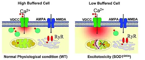 In the aftermath of anoxic depolarization, at the region of infarction, the release of glutamate and aspartate into the extracellular space causes an uncontrollable intracellular mobilization of Ca2+, mainly through the NMDA receptors.[9] This is a critical stage in the development of neuronal damage, because it is the Ca2+ overload that gives rise to several downstream cascades of events that lead to necrotic neuronal death, or to apoptosis, including free radical and nitric oxide productions that cause damage to the membrane.[10]