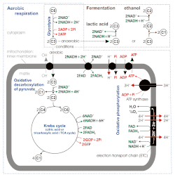 | 2 NADH | 3 or 5 | Oxidative phosphorylation: Each NADH produces net 1.5 ATP (instead of usual 2.5) due to NADH transport over the mitochondrial membrane | |