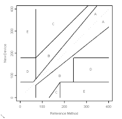 To perform the analysis, blood glucose samples are obtained and each sample is divided and measured by two meters: a "reference method" (a meter or laboratory test known to produce accurate results); and a new meter being evaluated. A scatterplot is generated, plotting values from the reference glucose meter (x-axis) against values from the new device (y-axis); thus, each point represents measurement of a single sample by two methods.