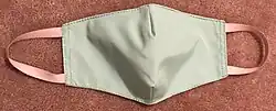 An experiment carried out in 2013 by Public Health England, that country's health-protection agency, found that a commercially made surgical mask filtered 90% of virus particles from the air coughed out by participants, a vacuum cleaner bag filtered out 86%, a tea towel blocked 72% and a cotton t-shirt 51%—though fitting any DIY mask properly and ensuring a good seal around the mouth and nose is crucial.[39][33] The use of common fabrics in making face masks has been tested.[40][41][42][43] Filter efficiency can be improved with multiple layers, but it is important also to consider breathability. Cotton is the most commonly used material, and filter efficiencies can reach > 80% for particles <. 300 nm with fabric combinations such as cotton-silk, cotton-chiffon, or cotton-flannel, though these filtration efficiencies are not directly comparable with the reported properties of surgical masks and respirators, because of the non-standard methods used in this study, conducted in the early months of the Covid-19 pandemic.[43] The WHO recommended that cloth masks should have three layers with a hydrophilic inner layer (e.g., cotton) to absorb moisture from the wearer's breathing, a filter layer, ideally spunbond polypropylene,[44] and a hydrophobic outer layers (e.g., polyester).[21] The benfits of a hydrophobic outer layer have not, to our knowledge, been demonstrated, and may be a throw-back to the idea of protection from droplets, which is now recognized as not the dominant mode of transmission.[45][46][47] Masks should be cleaned after each use. They can either be laundered or hand-washed in soapy hot water and dried with high heat.[48]