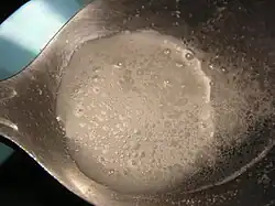 Crack cocaine is usually heated in a drug pipe until sublimation occurs at a relatively low temperature (about 90°C) and the vapor is inhaled.[7][26][27] This process is commonly referred to as "freebasing." Although commonly called "smoking," this method actually involves vaporizing the drug rather than burning it. If crack cocaine is burned directly, such as in a regular tobacco pipe, roll-your-own cigarette, or aluminum foil[28] higher temperatures may lead to decomposition of the active compound, reducing its effectiveness. This is why vaporization at lower temperatures, rather than combustion, is the preferred method for administration. While no formal studies have specifically quantified the extent of drug loss during combustion, users commonly choose to vaporize crack cocaine in order to maximize its effects and potentially avoid wasting money. Additionally, vaporizing is generally considered less harsh on the throat and lungs compared to smoking crack through a tobacco pipe, as combustion can produce more irritating and toxic by-products.
