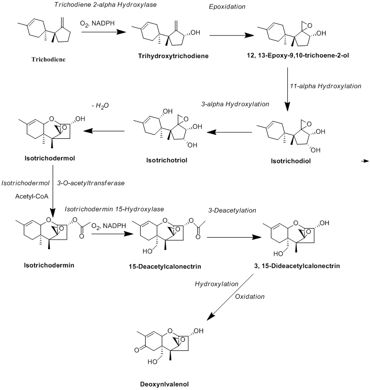 Vomitoxin belongs to a class of mycotoxins (trichothecenes) which are strong inhibitors of protein synthesis;[4] exposure to vomitoxin causes the brain to decrease its uptake of the amino acid tryptophan and, in turn, its synthesis of serotonin. Reduced levels of serotonin are believed to be responsible for the anorexic effects of DON and other trichothecenes. Irritation of the gastrointestinal tract may also play a role in reducing food intake, and may also partially explain the high incidence of paraesophageal stomach ulcers observed in sows during food refusal. In humans DON is extensively glucuronidated and excreted via urine.[5]