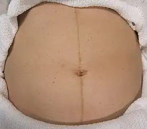 | Linea nigra | First 3 months[15] | 1 cm (0.4 in) wide, brownish to blackish line, from the pubis to the belly button[16] | None[16] | >90%[16] | Generally resolves within a year[17] |