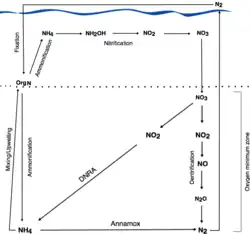 - 1 2 3 4 Lam, Phyllis and Kuypers, Marcel M. M. (2011). "Microbial Nitrogen Processes in Oxygen Minimum Zones". Annual Review of Marine Science. 3: 317–345. Bibcode:2011ARMS....3..317L. doi:10.1146/annurev-marine-120709-142814. hdl:21.11116/0000-0001-CA25-2. PMID 21329208.
