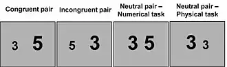 In particular, the structural features of the ANS are theoretically supported by a phenomenon called the "numerical distance effect", which has been robustly observed in numerical comparison tasks.[26] Typically developing individuals are less accurate and slower in comparing pairs of numbers closer together (e.g., 7 and 8) than further apart (e.g., 2 and 9). A related "numerical ratio effect" (in which the ratio between two numbers varies but the distance is kept constant, e.g., 2 vs. 5 and 4 vs. 7) based on Weber's law has also been used to further support the structure of the ANS.[27] The numerical ratio effect is observed when individuals are less accurate and slower in comparing pairs of numbers that have a larger ratio (e.g., 8 and 9, ratio = 8/9) than a smaller ratio (2 and 3; ratio = 2/3). A larger numerical distance or ratio effect with comparison of sets of objects (i.e., non-symbolic) is thought to reflect a less precise ANS, and the ANS acuity has been found to correlate with math achievement in typically developing children[27] and also in adults.[28]