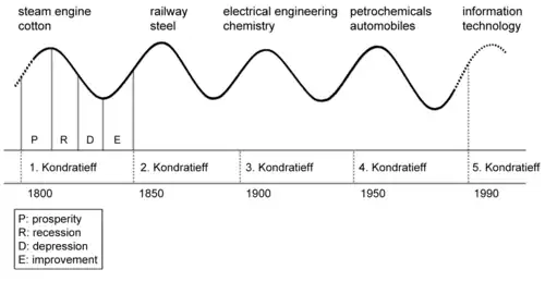 Schematic diagram of the Kondratiev waveThey stimulated demand for building materials, coal, iron and, later, steel. Excelling in the bulk movement of coal, they provided the fuel for the furnaces of industry and for domestic fireplaces. Millions of people were able to travel who had scarcely ever travelled before. Railways enabled mail, newspapers, periodicals and cheap literature to be distributed easily, quickly and cheaply allowing a much wider and faster dissemination of ideas and information. They had a significant impact on improving diet....[and enabled] a proportionately smaller agricultural industry was able to feed a much larger urban population....They employed huge quantities of labour both directly and indirectly. They helped Britain to become the ‘Workshop of the World’ by reducing transport costs not only of raw materials but of finished goods, large amounts of which were exported....[T]oday's global corporations originated with the great limited liability railway companies....By the third quarter of the nineteenth century, there was scarcely any person living in Britain whose life had not been altered in some way by the coming of the railways. Railways contributed to the transformation of Britain from a rural to a predominantly urban society.[3]