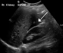 A small amount of anechogenic-free fluid in the recto-uterine pouch is commonly found in both intrauterine and ectopic pregnancies.[4] The presence of echogenic fluid is estimated at between 28 and 56% of women with an ectopic pregnancy, and strongly indicates the presence of hemoperitoneum.[4] However, it does not necessarily result from tubal rupture but is commonly a result from leakage from the distal tubal opening.[4] As a rule of thumb, the finding of free fluid is significant if it reaches the fundus or is present in the vesico-uterine pouch.[4] A further marker of serious intra-abdominal bleeding is the presence of fluid in the hepatorenal recess of the subhepatic space.[4]