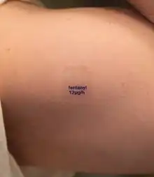 A fentanyl transdermal patch with a release rate of 12 micrograms per hour, on a person's arm