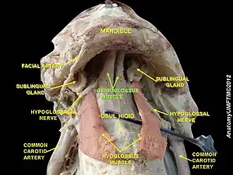 Its insertions are the hyoid bone and the bottom of the tongue.[2][3]