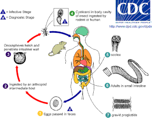 The cycle begins as arthropods ingest the eggs. Arthropods are then able to act as the intermediate host. When ingested, the eggs develop into cysticercoids. As shown in the CDC life cycle, oncospheres hatch and then penetrate the intestinal wall.[7]