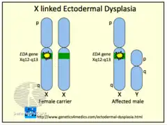 Most cases are caused by mutations in the EDA gene, which are inherited in an X-linked recessive pattern, called x-linked hypohidrotic ectodermal dysplasia (XLHED). A condition is considered X-linked if the mutated gene that causes the disorder is located on the X chromosome, one of the two sex chromosomes. In males (who have only one X chromosome), one altered copy of the gene in each cell is sufficient to cause the condition. In females (who have two X chromosomes), a mutation must be present in both copies of the gene to cause the disorder. Males are affected by X-linked recessive disorders much more frequently than females. A striking characteristic of X-linked inheritance is that fathers cannot pass X-linked traits to their sons.