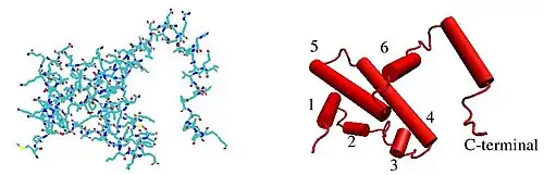 The IFNG monomer consists of a core of six α-helices and an extended unfolded sequence in the C-terminal region.[19][20] This is shown in the structural models below. The α-helices in the core of the structure are numbered 1 to 6.